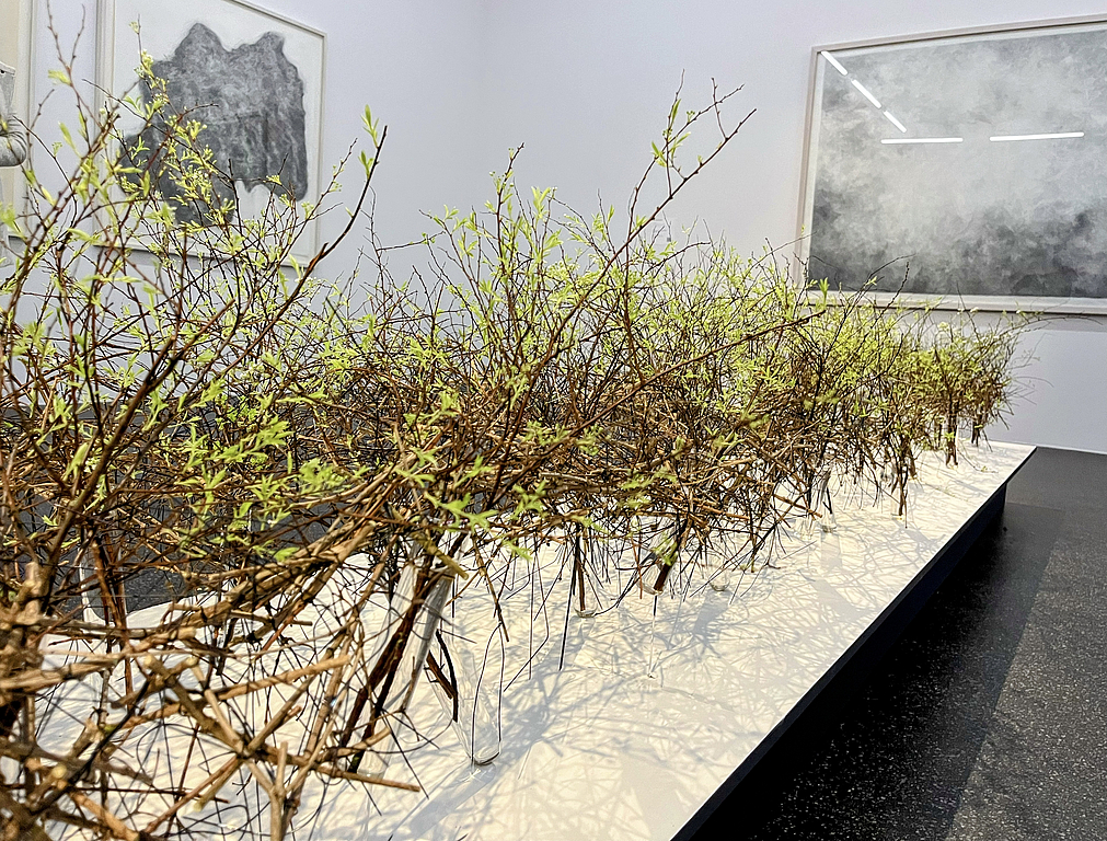 An der diesjährigen Ausstellung "Blumen für die Kunst" im Aargauer Kunsthaus habe ich das Werk von Marianne Kuhn ausgewählt ( ohne Titel) und floral interpretiert. Das, mit einzelnen Grafitstrichen geschaffene Bild in seiner kraftvollen und zugleich zarten, leichten Art mit Naturmaterialien umzusetzen, war mein Ziel.